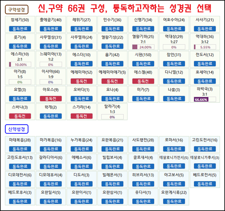 - 신,구약 66권 성경권 이름 표시, 이중 통독하고자 하는 성경권 선택.