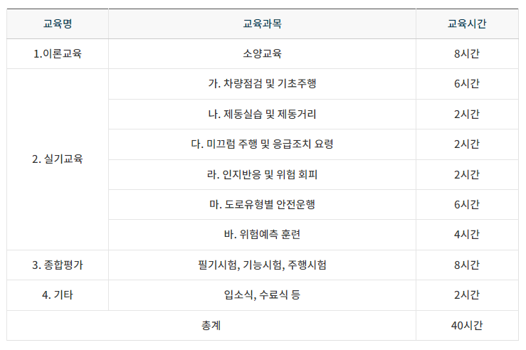 교육은 이론교육 / 실기교육 / 종합평가 / 기타로 구성되며 이론 및 실기교육 이후 종합평가에서 총점의 6할 이상을 취득시 이수가 가능 합니다. 필기의 경우 소양교육 과목, 실기교육시 차량점검 및 기초주행, 제동실습, 위험회피 및 예측훈련등의 교육이 이뤄 집니다.