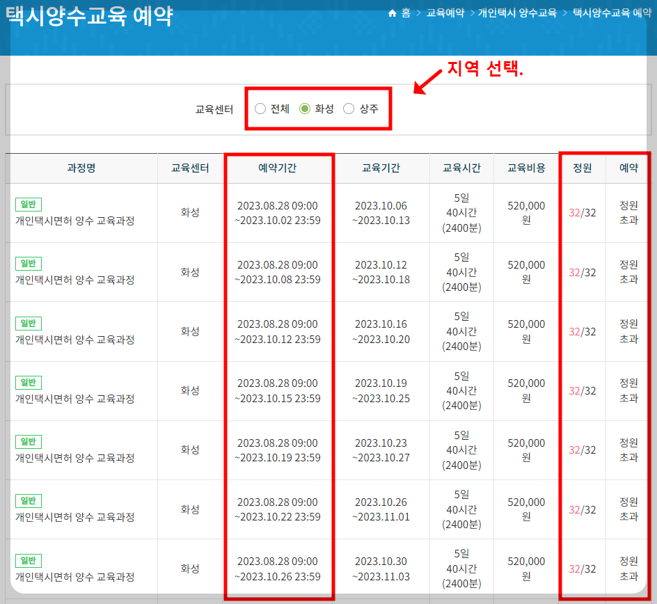현재 개인택시 양수교육은 화성 및 상주 두 지역 모두 12월 까지 예약 정원이 모두 초과된 상태입니다.  예약현황에 예약 탭이 있는 경우만 양수교육 예약이 가능하며, 반드시 예약기간 및 교육기간을 확인 후 신청하시기 바랍니다.