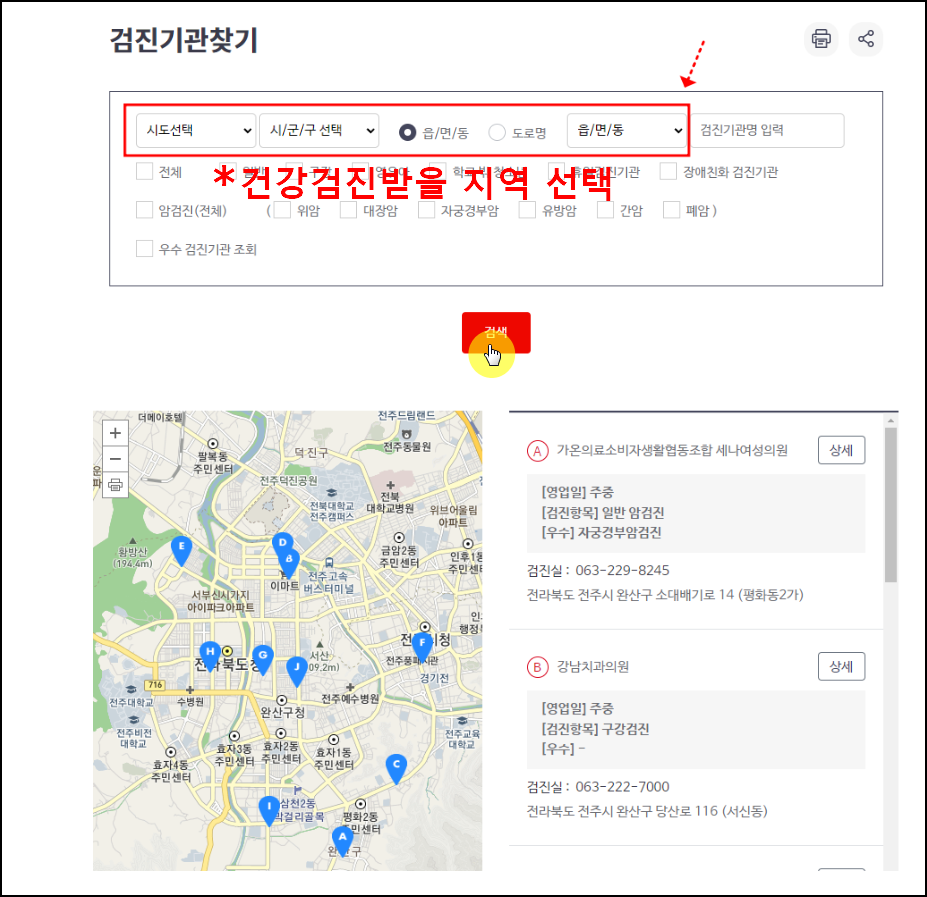 추가적으로, 검진 유형(예: 일반 건강 검진, 구강 건강 검진, 영유아 검진 등)을 선택가능. - 검색 버튼을 클릭한 후, 나타나는 검색 결과를 통해 본인이 검진을 받고 싶은 병원 선택.