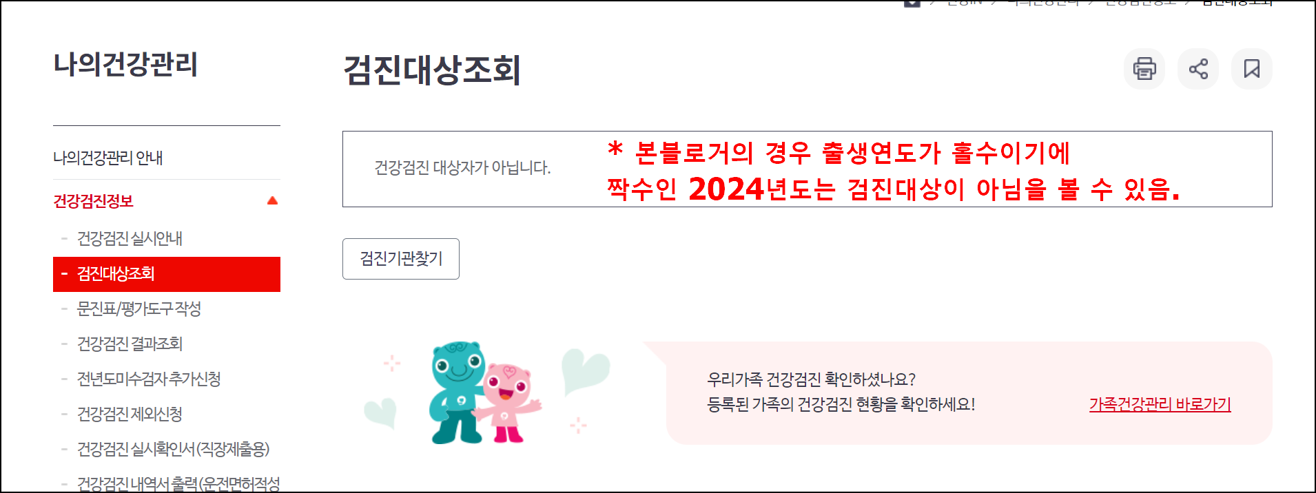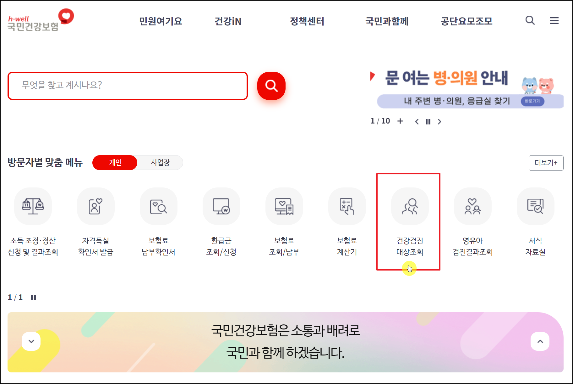 - 사이트 내에서 '건강검진 대상자 조회' 또는 '건강 iN 검진대상 조회'를 클릭.