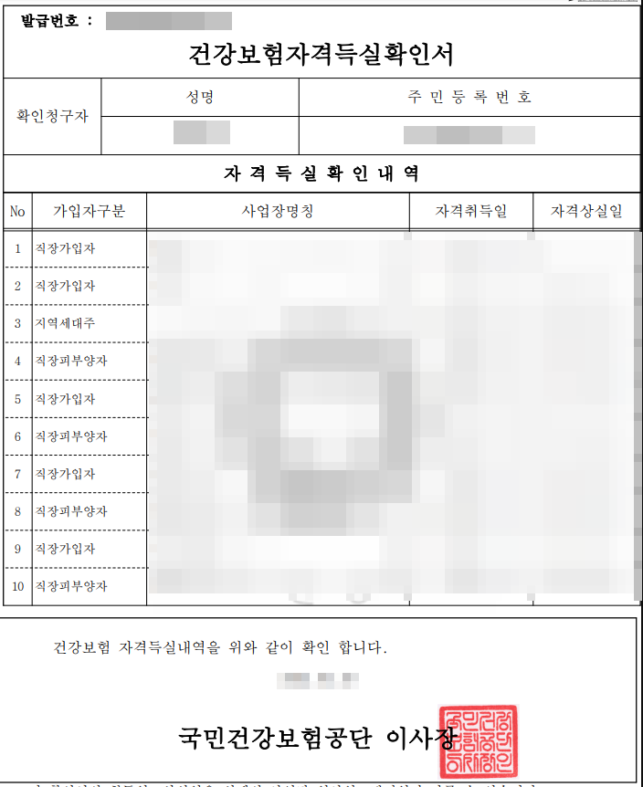건강보험 자격득실확인서란 국민건강보험 가입자 본인의 건강보험 취득일, 상실일 이력을 확인할 수 있는 증명서.