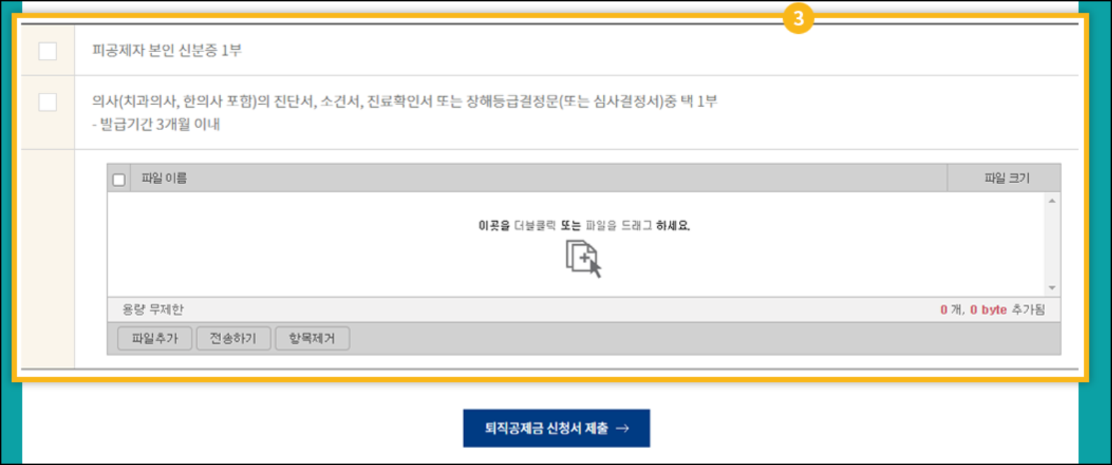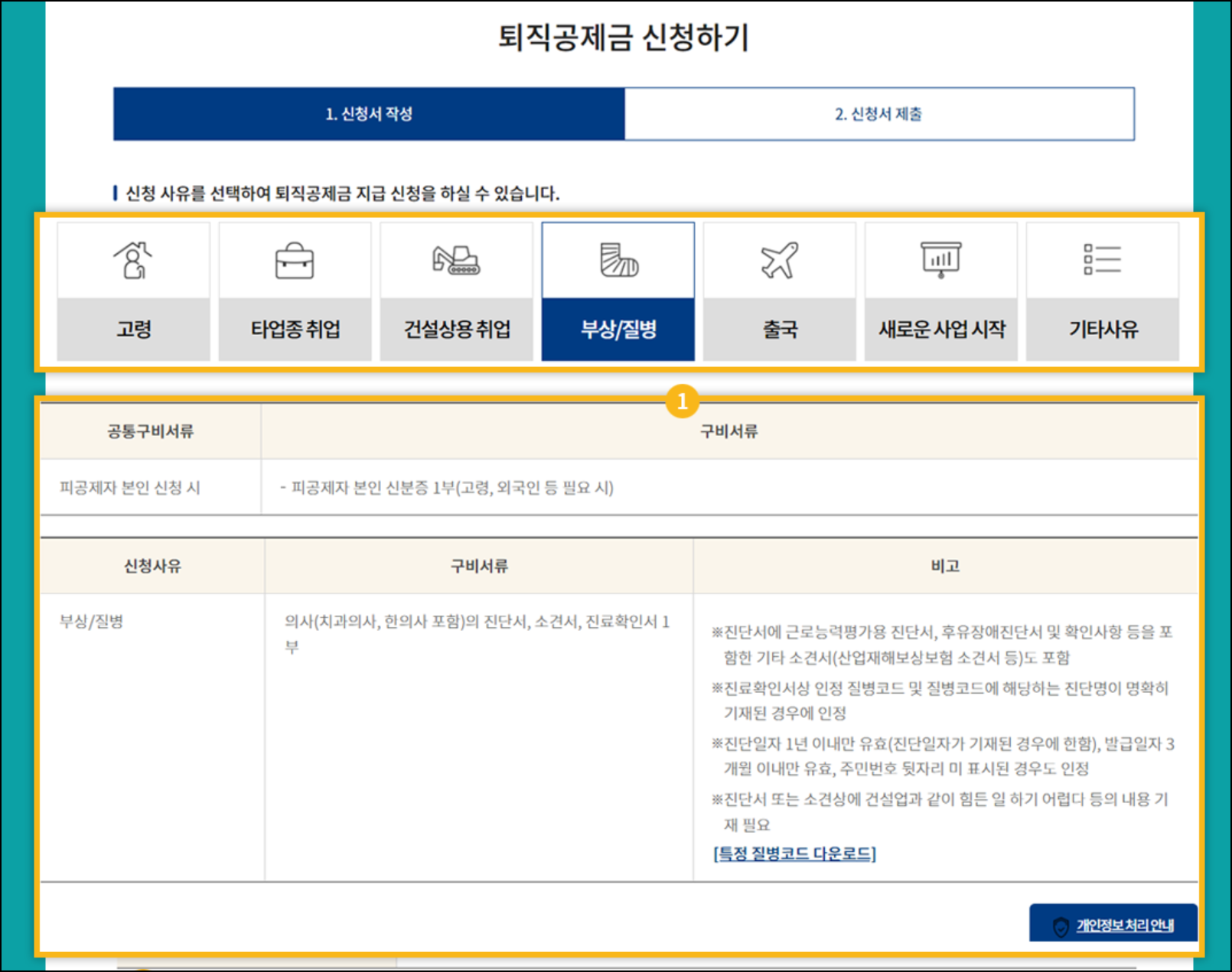 신청서 작성은 온라인 상으로 진행되며, 안내에 따라 정보를 입력하고 필요 서류를 제출하면 됩니다. 온라인 이용시 휴대폰 본인인증 또는 공동인증서등을 통한 본인인증이 필요하며, 퇴직 사유별 구비서류 업로드가 필요합니다.