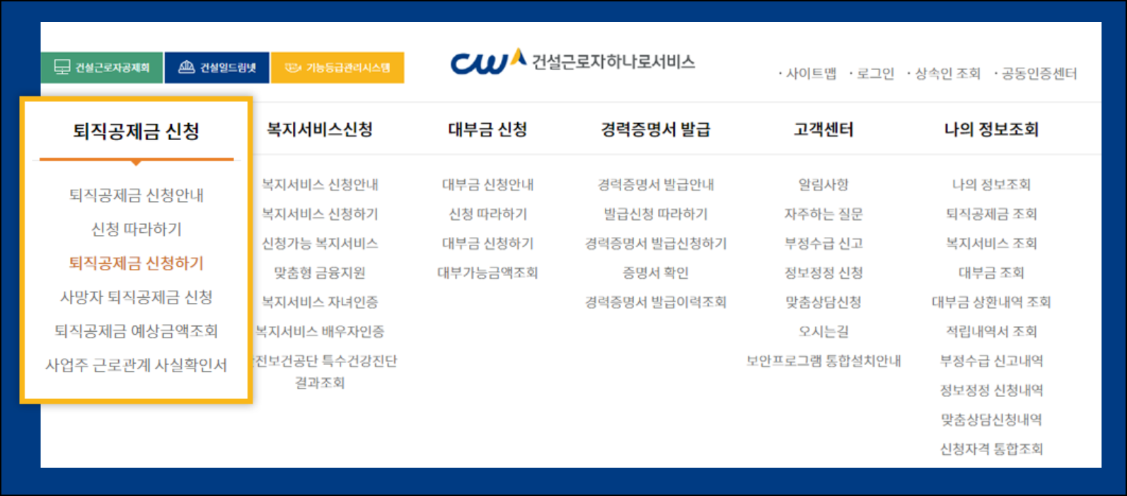 건설근로자 퇴직공제회 홈페이지내 퇴직금 신청 방법 및 죄회에 대한 정보는 홈페이지의 관련 메뉴를 통해 신청이 가능합니다. '공제제도 신청' 메뉴에서는 자격 요건 및 신청 절차에 대한 자세한 안내가 제공됩니다. 신청을 위해서는 근로 경력 증명 서류와 신분증 사본이 필요할 수 있습니다.