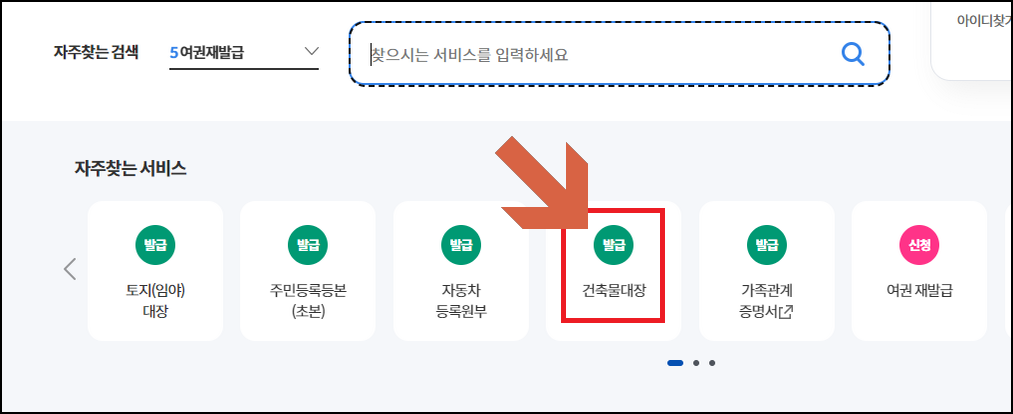 - 건축물대장을 검색 또는 배너에서 선택합니다.