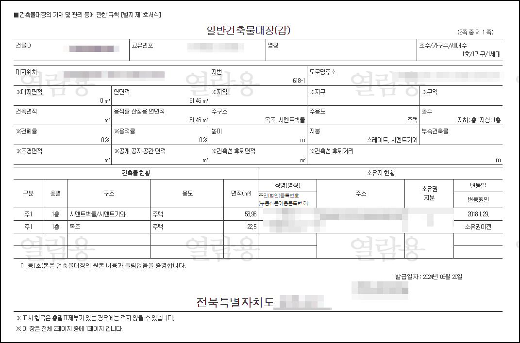 - 이력 사항: 건축물의 변경 이력, 수리 및 개조 내역 등이 포함되어 있어, 건축물의 변천사를 파악하는 데 유용합니다.