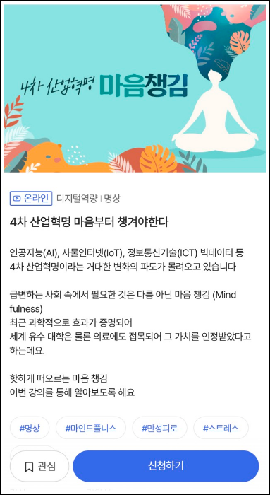 - 수강 신청 : 선택한 강좌에 대한 간단한 신청 절차를 거쳐 학습을 시작할 수 있습니다.