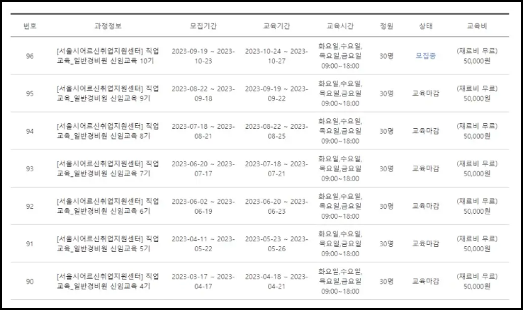 무료 교육의 경우 중장년의 나이 제약이 있는만큼 젊은 층의 신임교육은 대부분 비용이 발생됩니다.