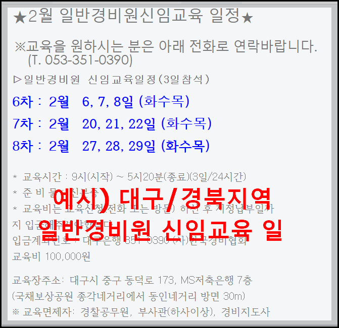 이상 오늘 포스팅에서는 일반경비원 법정 의무교육인 신임교육정보에 대해 알아보았습니다.
