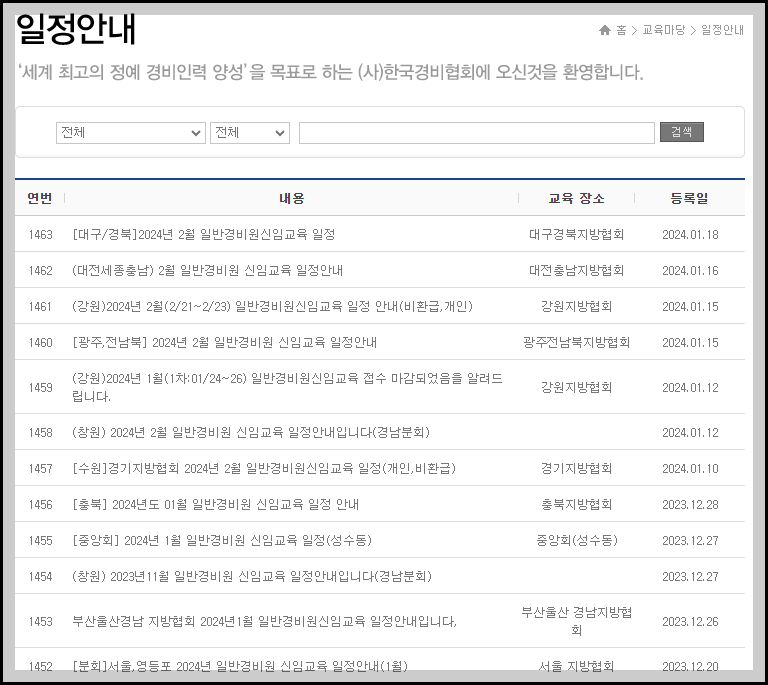 사단법인 한국경비협회 사이트 접속 후 교육마당 - 일정안내를 클릭 후 본인 거주지 지역에서 진행하는 일정을 확입합니다. 이후 교육 신청은 각 지방 협회로 유선 또는 방문접수를 통해 시행되고 있습니다.