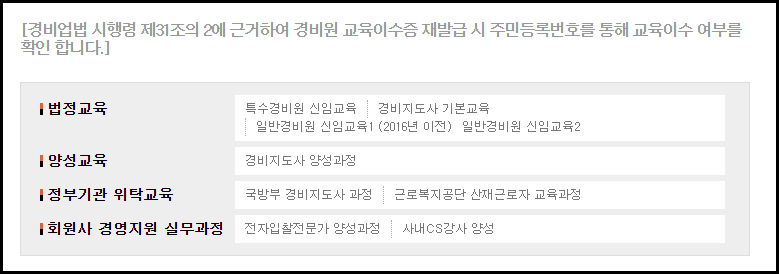 - 일반경비원 신임교육 - 사단법인 한국경비협회를 통해 이수 가능.