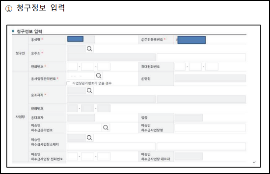 - 청구인 토탈 로그인 정보로 성명 주민등록번호 자동 입력됨 주소 전화번호 필수 입력.