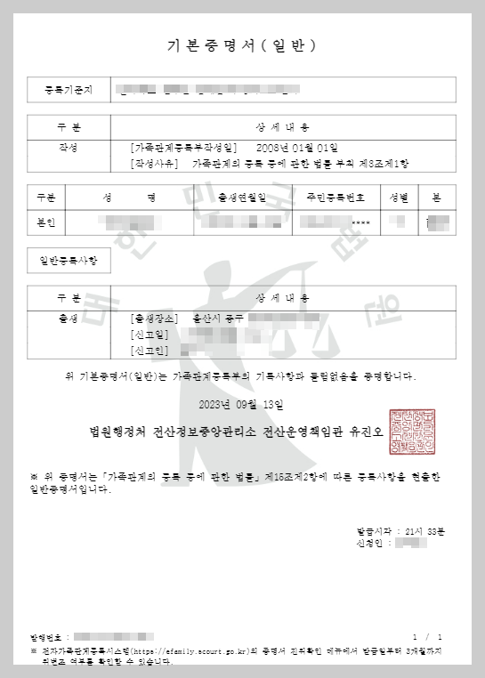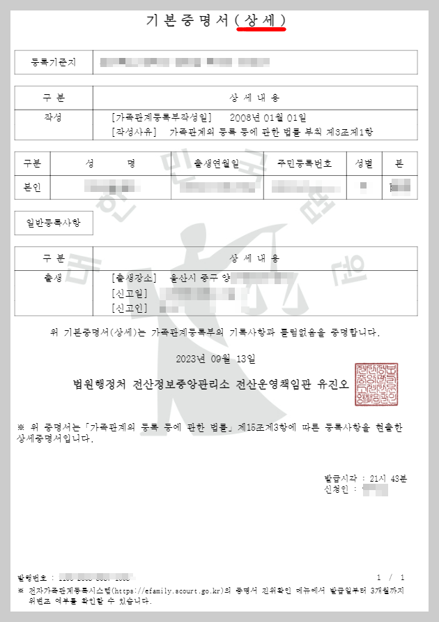 기본증명서는 개인의 기본 사항이 기재되는 문서로 가족관계등의 정보와 본인의 이름, 출생년월일, 주민등록번호와 성별, 본, 출생장소등이 기록되어 있습니다. 주로 변동 사항을 증명하기 위한 서류로 사용, 주민등록번호를 변경하거나 개명하여 이전 정보 확인이 필요할 시, 국적취득자의 성본창설, 입양관계증명서등의 사유로 요구되곤 합니다.