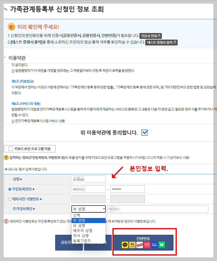 • 가족관계등록부 신청인 정보 조회. ( 신청인 정보 입력 후 본인인증 로그인)