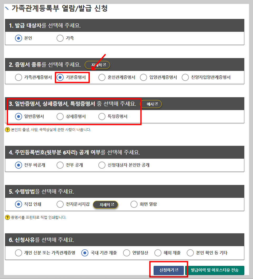 기본 증명서를 제출용으로 발급받고자 하는 경우 증명서 제출 요구자(관공서, 화사, 은행등)에게 필요한 증명서의 종류를 미리 확인한 뒤 발급받으시길 권장 드립니다.