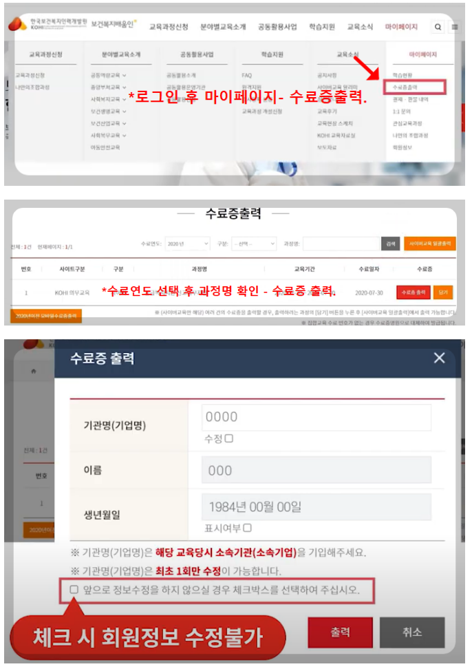 수료증을 발급받기전 반드시 수료 년도를 설정, 출력할 수료증 과정명을 다시한번 확인 후 기관명, 개인정보등을 입력합니다. 이후 출력 버튼을 통해 수료증을 실시간 출력 할 수 있습니다.