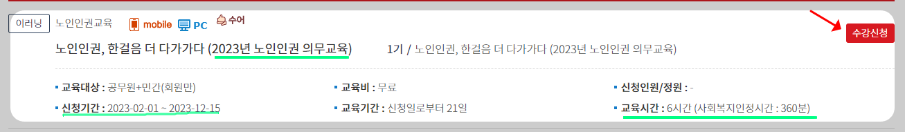 - 2023년 노인인권 의무교육인 노인인권 한걸음 더 다가간다 수강신청.