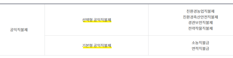 농업 활동등을 통하여 식품안전, 농촌유지등 공익 창출을 위하여 농업인에게 지원되는 보조금 제도로 농업 농촌 공익 직불법에 의거, 기본형 공익 직불제 및 선택형 공익 직불제로 구분되어 집니다.