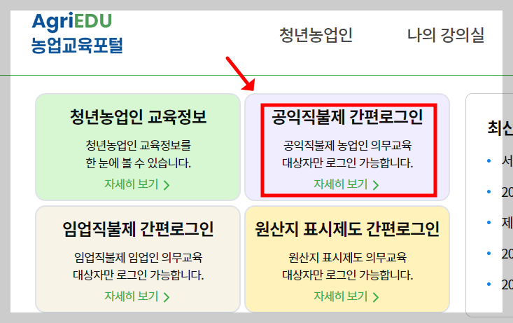 - 농업교육포털 우측 상단 로그인 또는 화면 내 공익직불금 간편로그인 클릭.