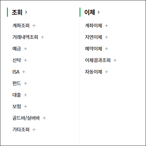 | 조회/이체 | 계좌 조회, 계좌 이체, 대량 이체 등 |
