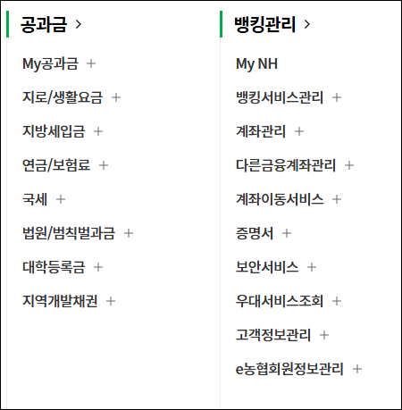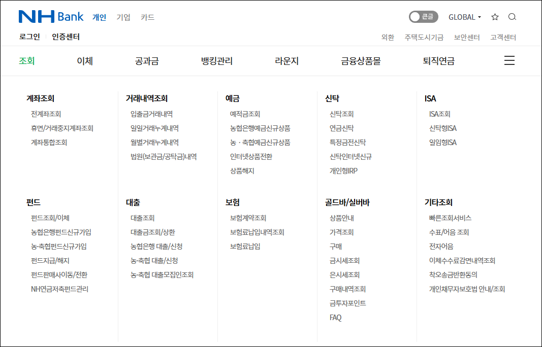 농협 인터넷뱅킹 주요 메뉴 구성
