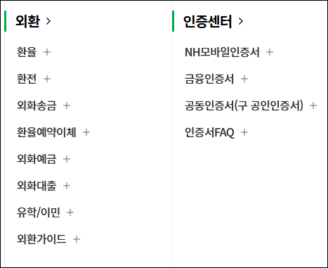 | 외화송금 | 국내외 외화 송금 서비스 | 해외로 외화를 송금하거나 국내외 외화 거래 서비스 제공 |