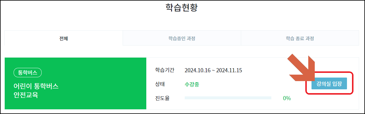 4. 마이페이지 - 학습현황에서 강의실 입장하여 동영상 100% 수료