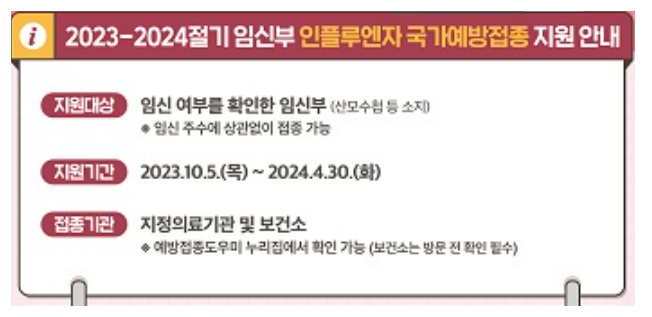 임신여부를 확인한 임신부가 지원대상으로 임신 주수에 상관없이 접종이 가능합니다. 본 블로거 또한 작년 임신중일때 산부인과 정기 진료와 더불어 독감 접종을 무료로 진행하였습니다. 임산부들의 접종 기간은 2023년 10월 5일 ~ 2024년 4월 30일까지이며, 검진 산부인과 방문시 임산부수첩등이 필요하지 않으나 일반 병원에서 접종시 임신을 확인할 수 있는 임신 확인서 또는 산모수첩등을 지참후 방문하시기 바랍니다.
