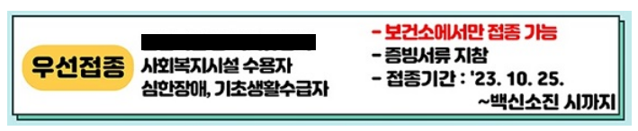 | 우선접종 | 국가유공자, 기초생활수급자, 심한장애를 가진자, 사회복지시설 수용자. |