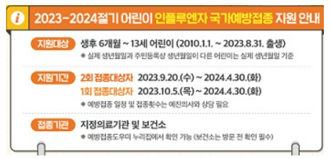 2010년 1월 1일 ~ 2023년 9월 31일 출생한 어린이가 대상이며 독감 접종이 처음인 경우 접종 횟수는 4주 간격 2회 진행이 되며, 만 9세 이상 어린이 또는 독감 예방 접종력이 2회 이상 있을 시 매년 1회 접종합니다.