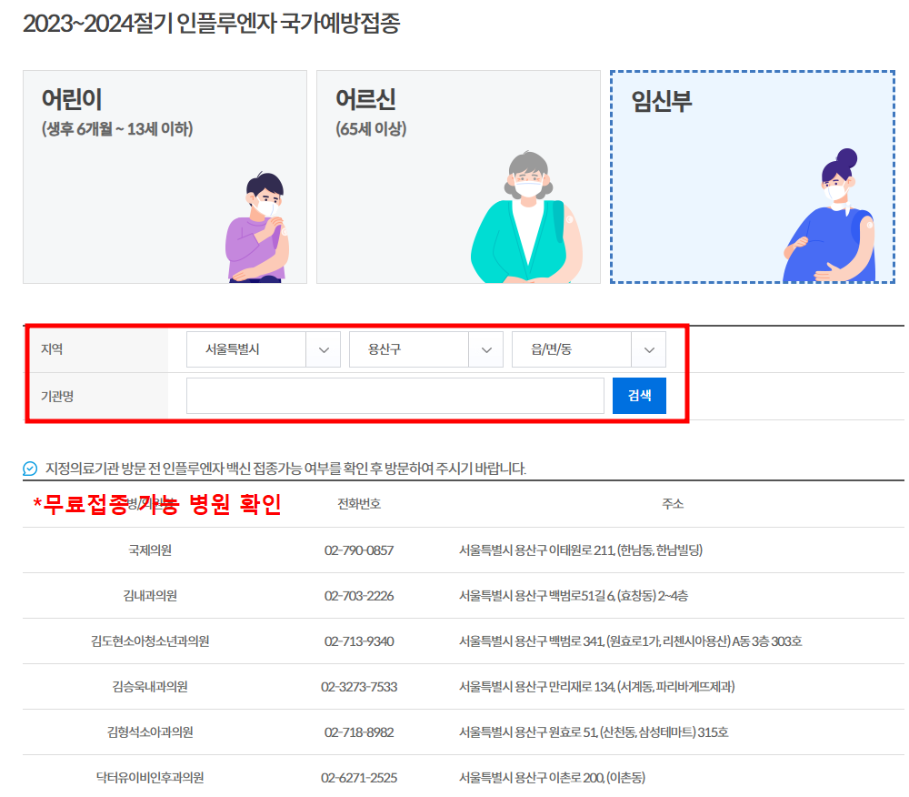 독감 무료접종 대상 장소 조회.