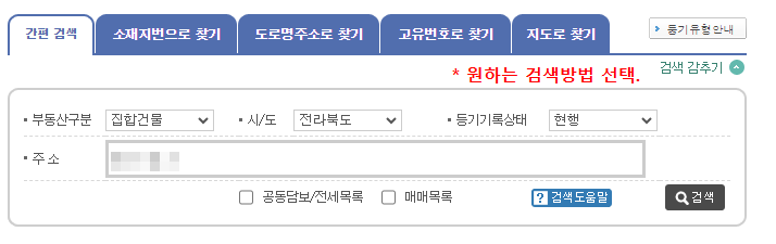 - 등기부등록 주소지 종류 및 소재지번 확인 후 수수료 결제.