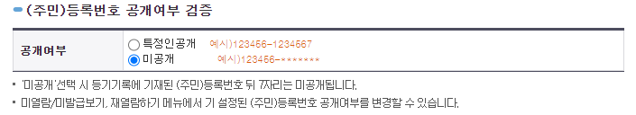 - 주민등록번호 공개여부 선택. (기관등 제출시 주민등록번호 뒷자리까지 요구될수 있으니 제출기관 사전확인필요)