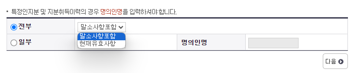 - 말소사항 포함 or 현재 유효사항 선택 후 다음. (말소사항포함 선택시 모든 등기사항이 기록된대로 공시)