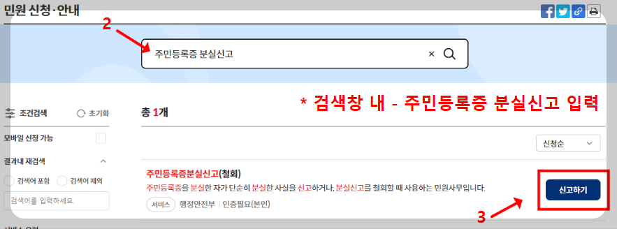 - 민원 24 사이트를 통해 주민등록증 분실신고 가능.