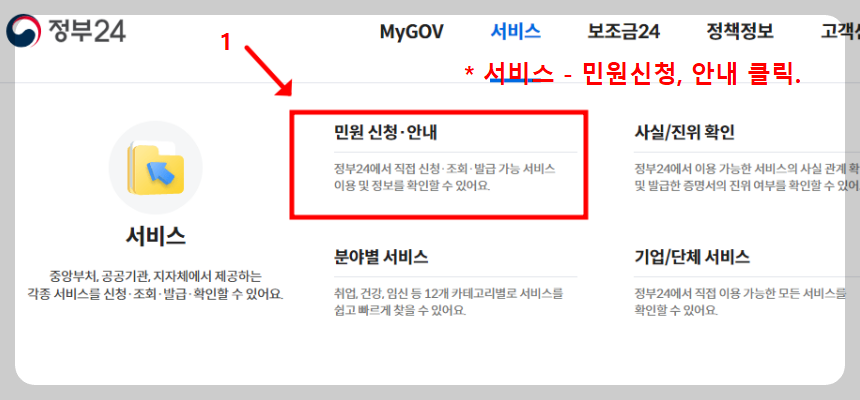 - 상단 탭내 서비스 - 민원신청안내 선택.
