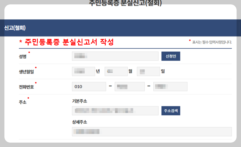 - 신고서 작성 (본인 개인정보 및 분실일등)
