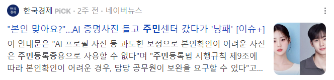 최근 AI 프로필 사진등 과도한 보정으로 인하여 본인 확인이 어려운 사진을 주민등록증용으로 사용하려는 사례가 빈번해 지고 있습니다. 이러한 사례들이 발생함에 따라 행정안전부에서 지난 6우러 27일 주민등록증 사진에 변형이 가능하거나 본인 확인이 어려운 사진은 사용할 수 없다고 입장을 밝히며 당부사항을 전하기도 하였습니다. 현재 주민등록법 시행규칙 등에 의거 주민등록증이나 운전면허증, 여권 등의 신분증 사진은 6개월 이내에 모자등을 쓰지 않고 촬영한 천연색 상반신 정면 사진이어야 합니다.
