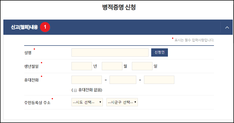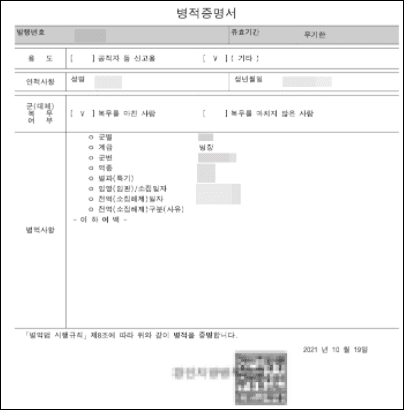 | 병적 기록이 존재하지 않음 | 병무청(☎ 1588-9090) 문의 |