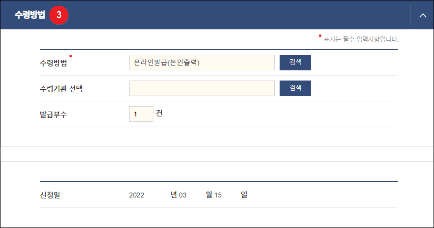 - 발급 방식 선택 (온라인 PDF 다운로드 또는 우편 발송)