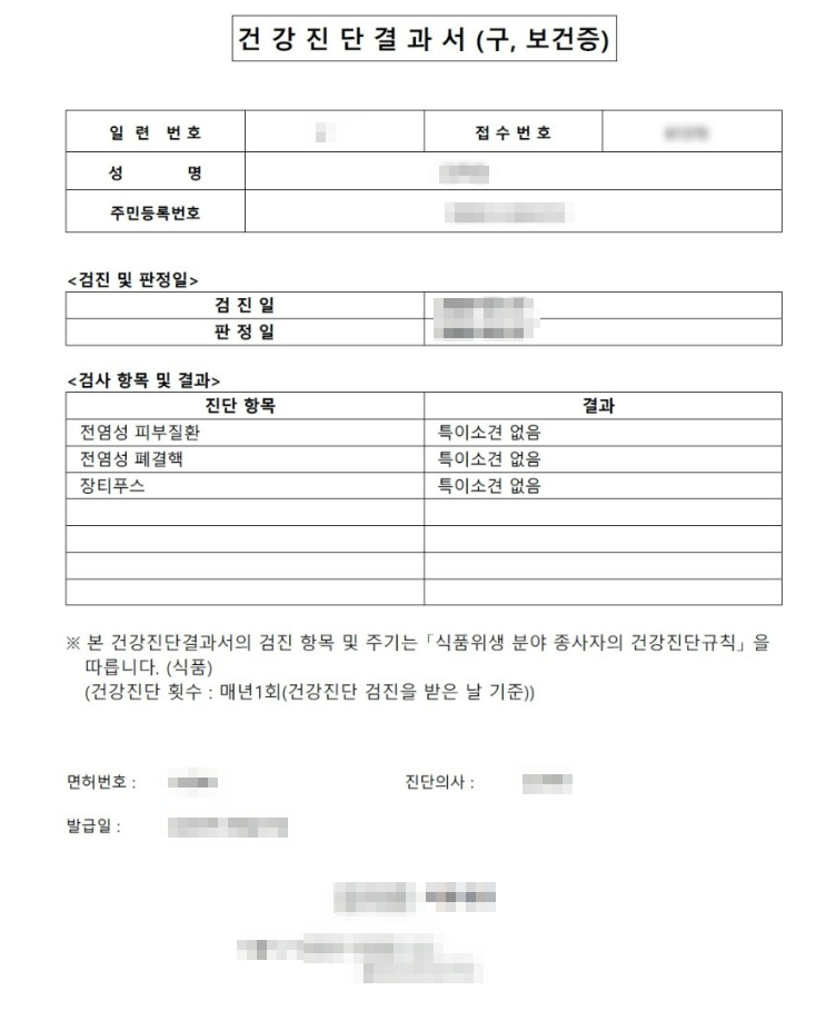 보건증 검사항목의 경우 식품위생분야 종사자의 건강진단 규칙에 의거 법으로 정해져 있습니다.