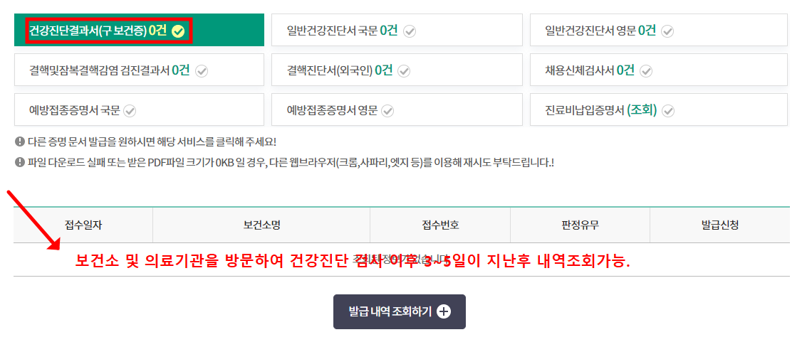 단, 보건증 온라인발급의 경우 판정결과가 정상인 경우에만 조회가 가능하며, 그외는 해당 의료기관을 방문하여 발급해야되며 e 보건소 사이트내 조회의 경우 공공 보건 의료기관의 내역만 조회가능합니다 (사립병원은 제외)
