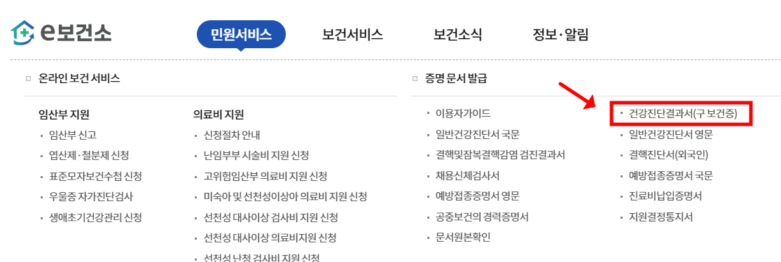 - 민원서비스 - 건강진단결과서(구보건증) 클릭.