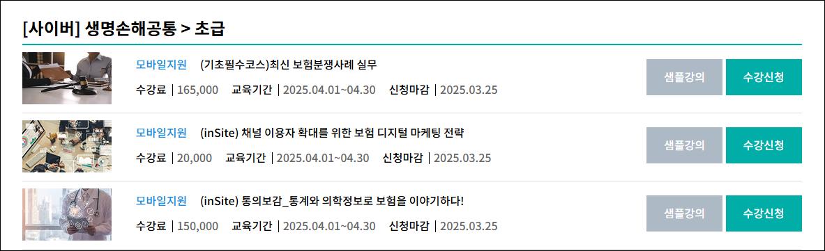 교육 과정은 주제별로 세분화되어 있으며, 보험법, 리스크 관리, 상품 개발 등 다양한 분야를 다루고 있습니다. - 수강 신청 및 결제