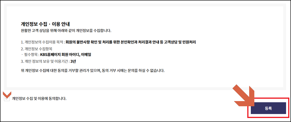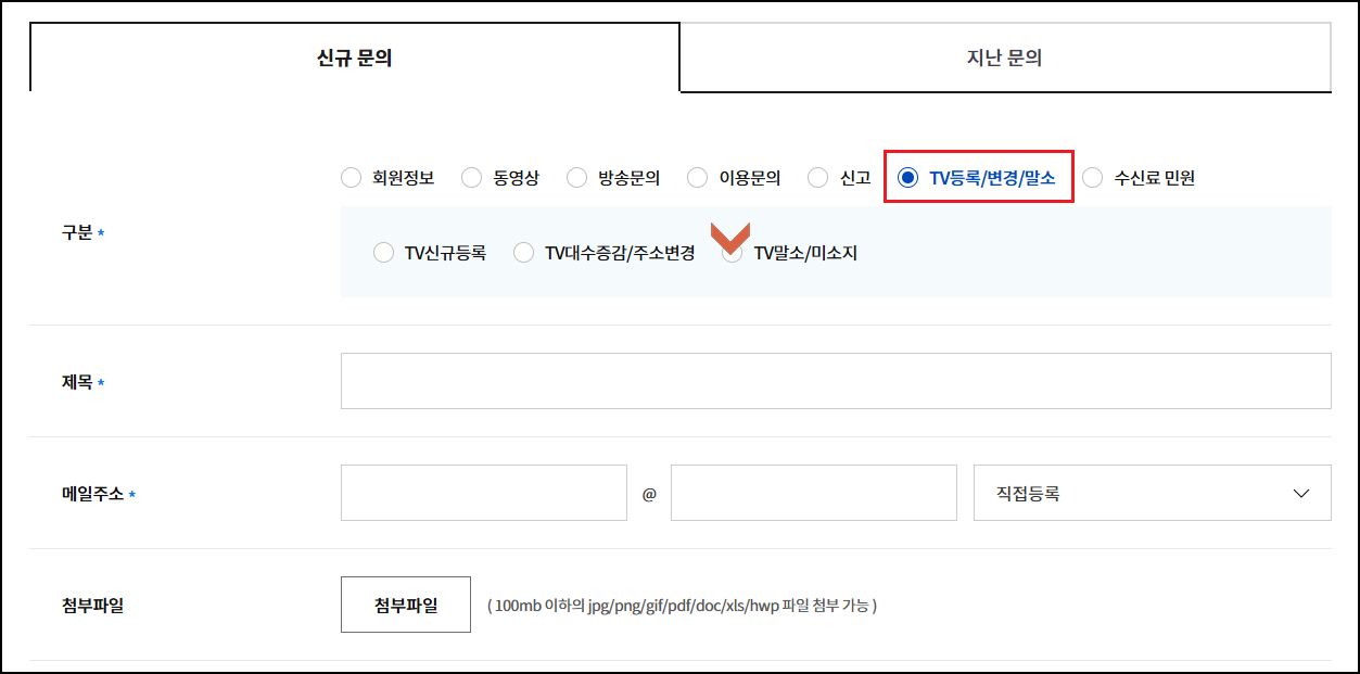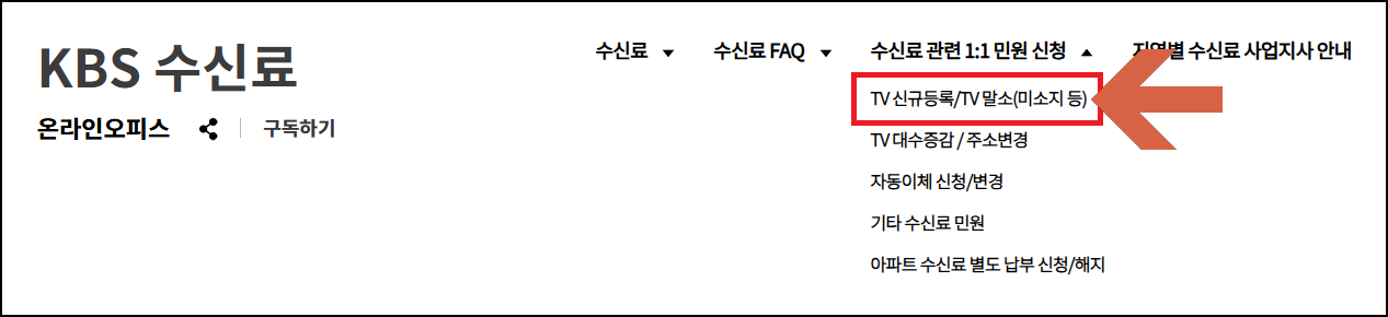 수신료 관련 1:1민원신청 - TV신규등록/TV말소(미소지등) 클릭.
