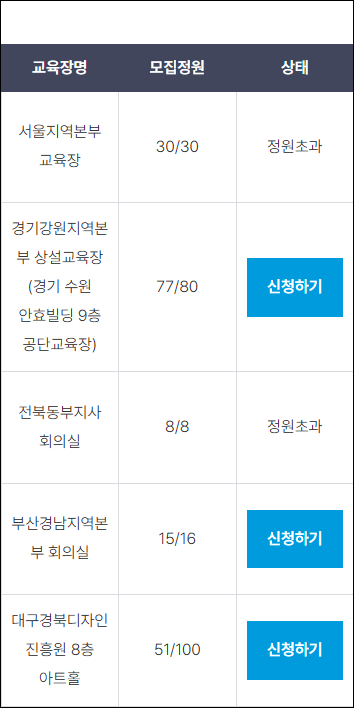 - 교육 일정 및 지역별 교육 장소를 확인한 후, 희망하는 날짜를 선택합니다. - 신청서 작성 및 제출