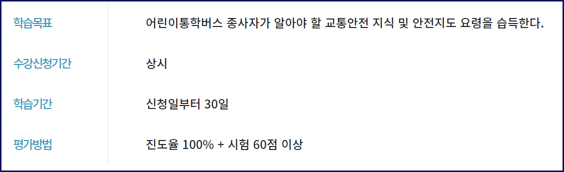 - 해당 신규 교육은 어린이 통학버스 운영 또는 운전 시작전 이수가 필요합니다.