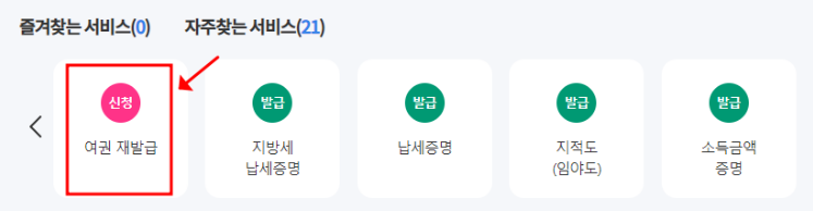 - 정부 24 사이트 접속 후 여권 재발급 신청 클릭.