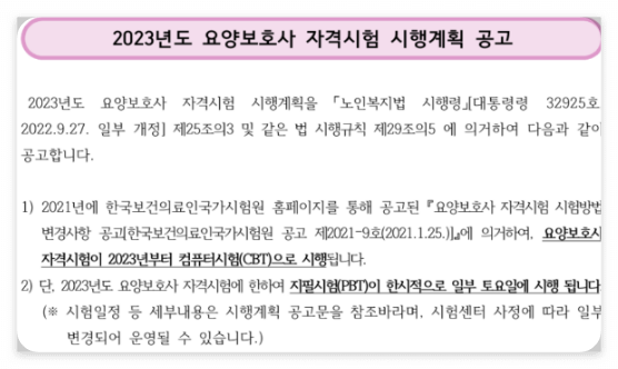 올해인 23년도 부터는 요양보호사 자격증 시험응시 방법이 컴퓨터 상시 시험으로 변경되었습니다. 허나, 중장년층 재취업으로 수요가 높은 자격증인 만큼 이러한 부분을 고려, 23년 한해 자필 시험이 일부 토요일에 시행되고 있습니다.