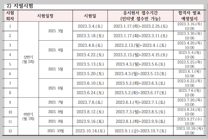 23년도 시험일정을 보게되면, 토요일 한시적 지필 시험이 이뤄지는 것을 볼 수 있습니다. 자격증 시험 응시시 오전 시험은 8시 20분 입장을 시작으로 9시 반에 입장 완료되며, 시험은 10시 정각에 시작 됩니다. 시험시작은 10시부터 ~ 11시 30분까지 90분간 진행됩니다. 2교시 시험 또한 입장시작이 12시 반 ~ 13시 까지 입실해야되며, 시험은 13시 30분 ~ 15시까지 총 90분간 시행됩니다.